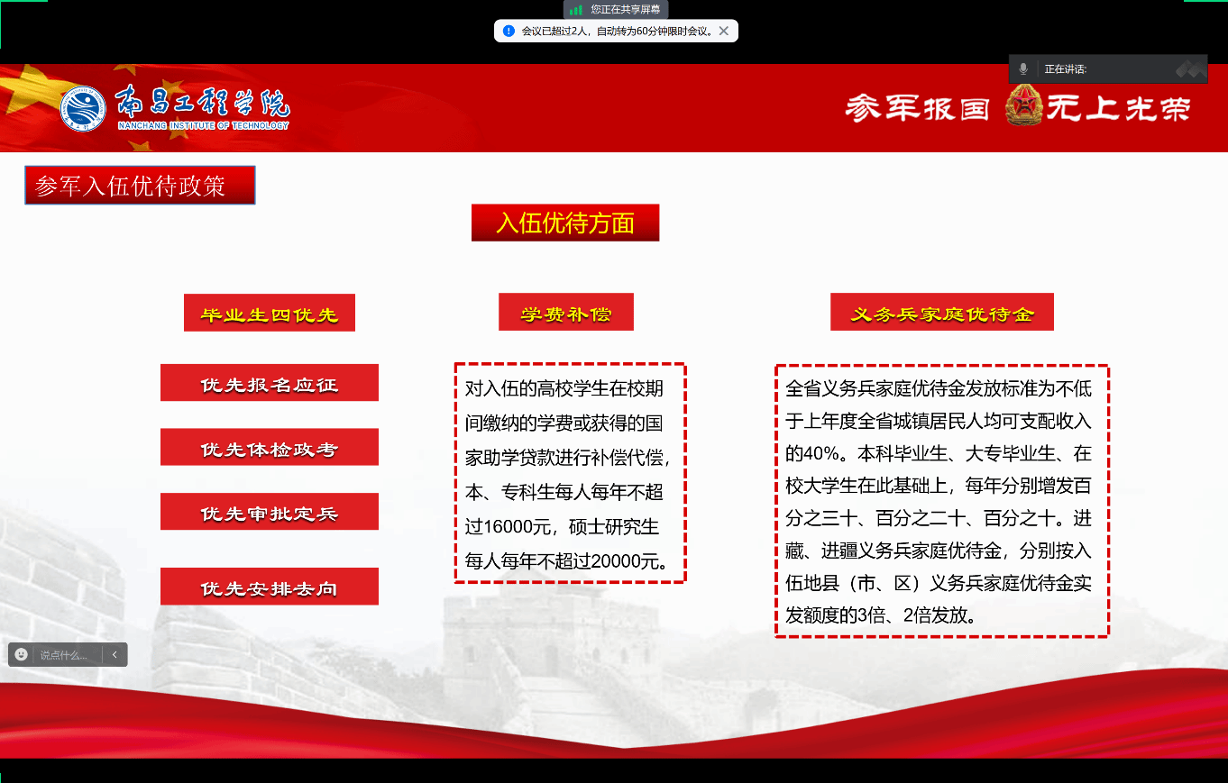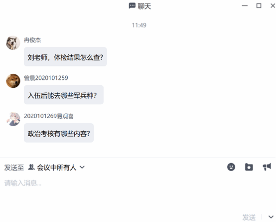 会上,班主任们从大学生征兵的政策、应征入伍条件、报名流程、注意事项、参军入伍优势、职业发展、优抚优待、就业升学等方面进行了全面分析和解读,并重点阐述了同学们关注的报名条件、学费或助学贷款补偿代偿、退役士兵考研等相关问题。同时,针对同学们提出来的疑问,老师们一一进行耐心解答。