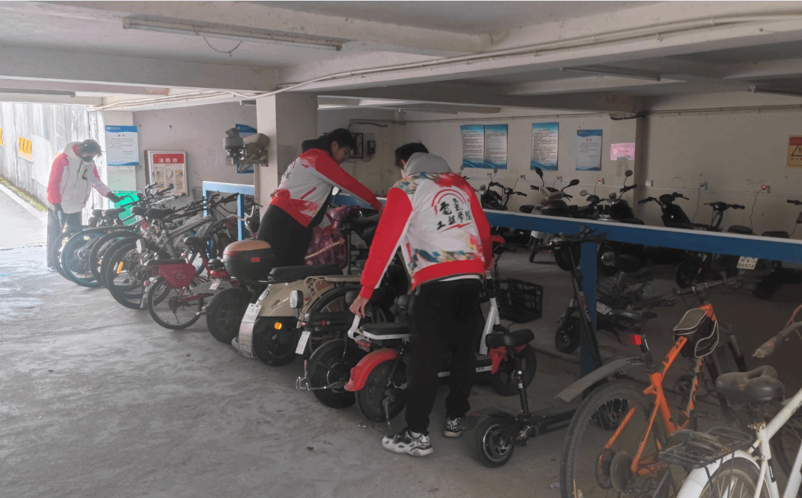 活动中,志愿者们依次将杂乱的电动车车摆放整齐,他们两个或多个人通力合作挪到沉重的电动车摆放到指定区域,忙碌的身影不断的穿梭在各个停车地点,让原本停放凌乱的车辆渐渐变得整齐有序,通道也变得亮宽敞,有效解决原先车辆充电时乱停乱放和占用道路的问题,也让停车位变得干净整洁,让师生感到舒心。